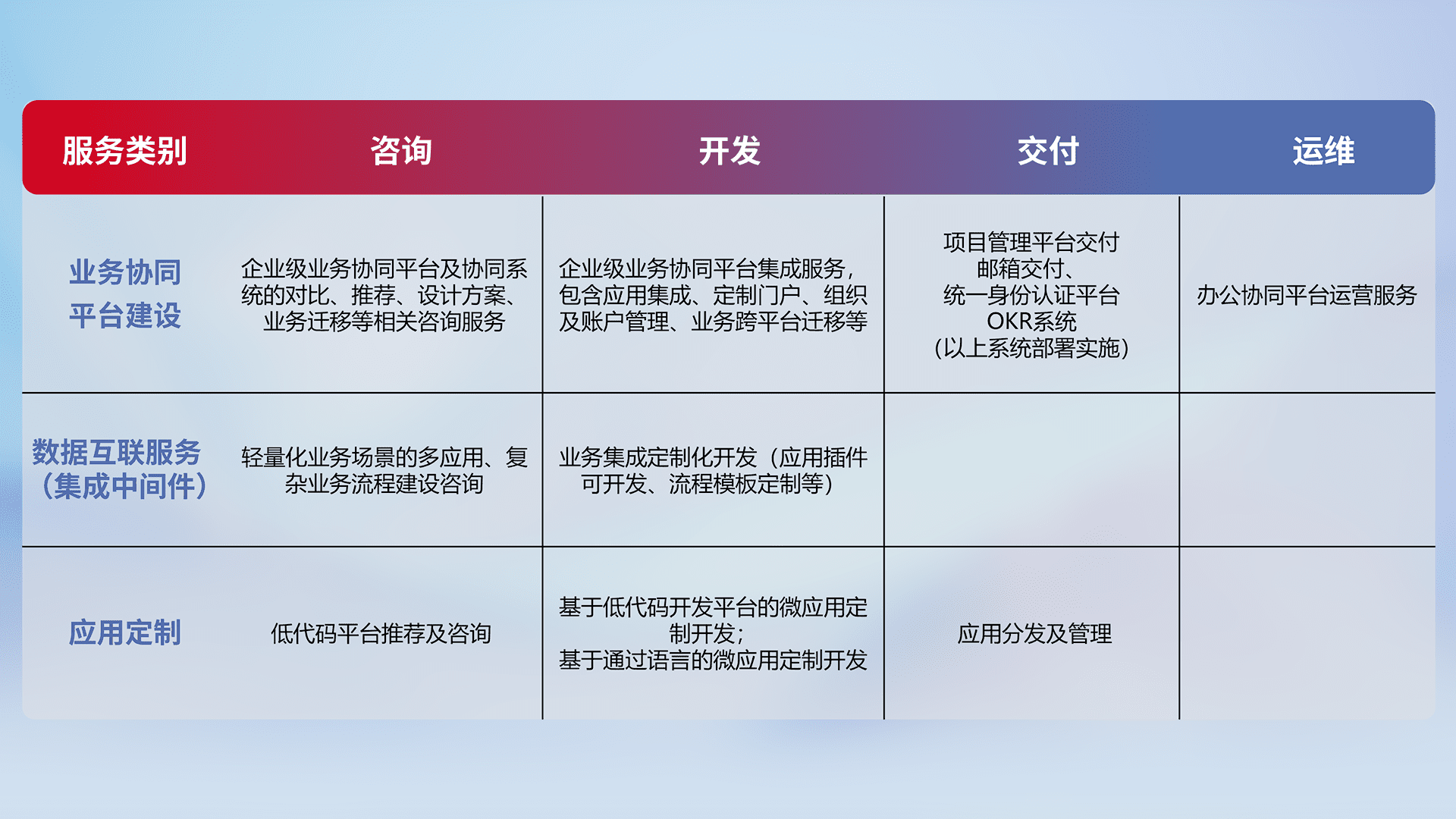 针对钉钉、、、企微、、、、IDaas等平台级产品提供产品的规划、、方案、、、交付、、定制化开发等服务,,,实现如统一协同办公、、智能客户服务、、混合会议管理、、、、智能数据查询、、、等业务场景,,,,实现数字化转型。。