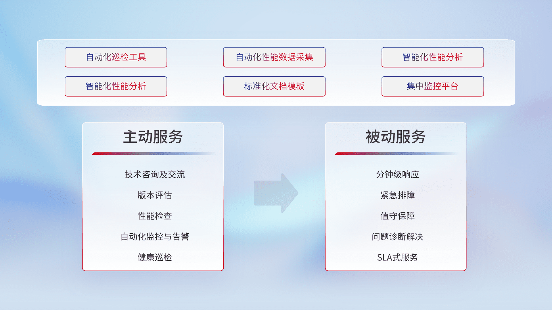 智能化工具和标准化文档,,保障服务质量,,,,提供主动服务(包含技术咨询、、、版本评估、、、、性能检查、、、、自动化监控与告警、、、、健康巡检)和被动服务包含(分钟级响应、、、紧急排障、、值守保障、、、问题诊断解决、、、SLA服务)。。。